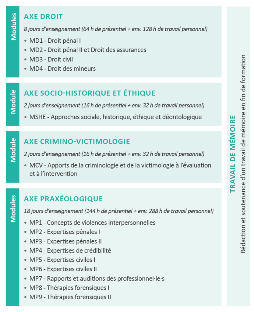 - En droit pénal, civil et administratif (en particulier en droit des assurances), acquérir les bases théoriques permettant de réaliser des expertises et thérapies d’enfants, d’adolescent·e·s et d’adultes dans le champ forensique
